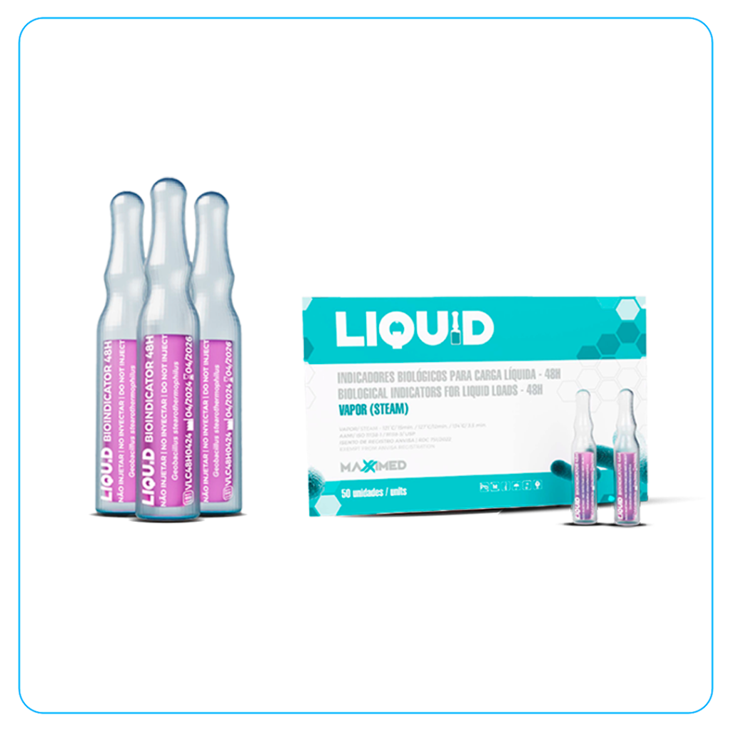 - O Indicador Biológico LIQUID está disponível em caixas com 50 unidades e em conformidade com as Normas AAMI/ISO 11138-1, AAMI/ISO 11138-3 e USP.